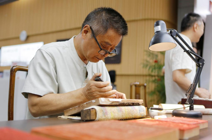 8月22日,在揚(yáng)州市圖書(shū)館,江蘇省雕版工藝美術(shù)大師沈樹(shù)華在“古籍里的揚(yáng)州運(yùn)河文化”市集上為市民展示雕刻技藝。