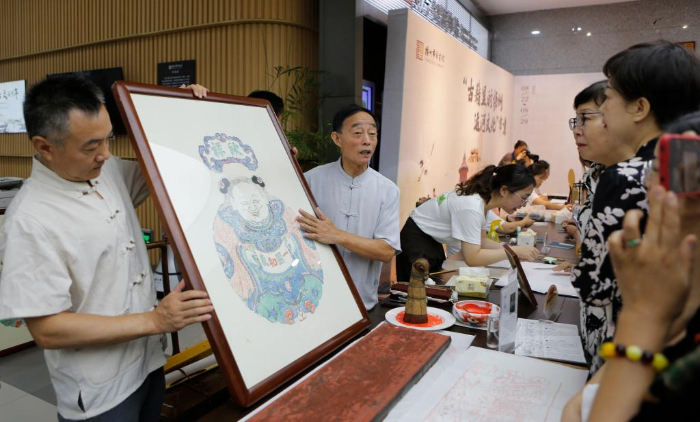 8月22日,在揚(yáng)州市圖書(shū)館,雕版印刷技藝代表性傳承人李江民在“古籍里的揚(yáng)州運(yùn)河文化”市集上為市民展示雕版印刷品。