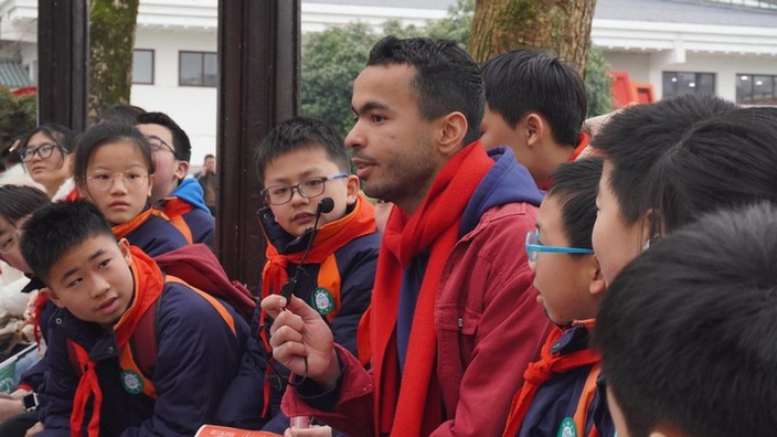 走出場館,中外青年圍坐在雷鋒紀念館外的長廊暢聊雷鋒精神。在分享初到中國時迷路,被身邊一位“活雷鋒”幫助的故事時,來自阿爾及利亞的留學生名善深有體會地說到:“真正的善行是發(fā)自內(nèi)心、純粹無私的。”交流中,不一樣的面孔也吸引了來自株洲市荷塘小學小朋友們的關注,在文化擺渡者志愿服務隊的翻譯下,留學生們與小朋友們打破了語言的壁壘,實現(xiàn)了關于雷鋒精神內(nèi)涵的無障礙交流。