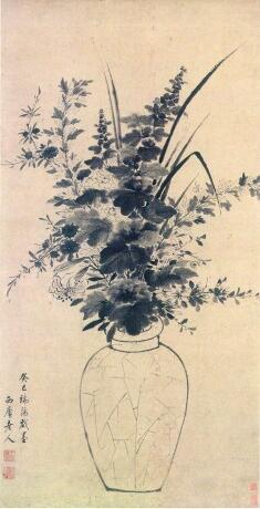 清初畫(huà)家王時(shí)敏的《端午景圖》《端陽(yáng)墨花圖》,將艾草、蜀葵、柳條、石榴花等時(shí)令花草引入畫(huà)中,寄予驅(qū)邪納福的寓意。畫(huà)中所寫花草濃墨與淡墨相間,層次分明,體現(xiàn)出駕馭水墨的嫻熟技藝。值得一提的是,《端午景圖》中的瓷瓶為帶冰裂紋的豐肩斂腹瓶,這種將瓷器表面花紋如實(shí)描繪出來(lái)的現(xiàn)象,在古代花鳥(niǎo)畫(huà)中并不多見(jiàn),由此可見(jiàn)畫(huà)家獨(dú)特的筆墨趣味。