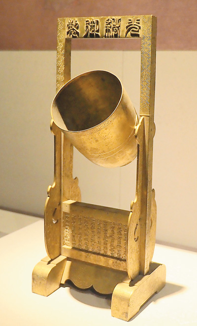 一件造型獨(dú)特的金色器物吸引了記者注意。達(dá)微佳介紹,這是故宮博物院藏清代銅鍍金欹器。欹器是一種傾斜易覆的盛水器,中空時,會向一側(cè)傾斜;注水一半時,能保持端正;水注滿時,會傾覆倒出,生動展現(xiàn)了儒家“不偏不倚,無過不及”的中庸之道。據(jù)文獻(xiàn)記載,孔子曾在魯桓公之廟觀欹器,并向?qū)W生講解它的道理。古時國君將欹器置于座右,作為修身之戒,因此又稱“宥坐之器”。