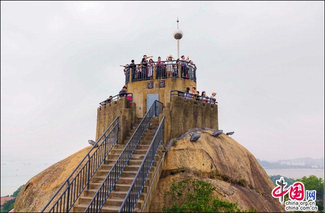 說到自然風(fēng)光,便不能不提日光巖——這島上的最高峰。日光巖別名“晃巖”,相傳1641年,鄭成功來到此地,見此地風(fēng)景勝過吉林日光山,便把“晃”字拆開,稱之為“日光巖”。要登臨此巖,一窺日光,便要辛勞走一段山路。其間渾圓的巨石層出不窮,蒼郁的古樹隨處可見,更有閩南大厝、名人題字與這些自然風(fēng)景相得益彰。于是游人往往在心曠神怡中,路過“九夏生寒”“鷺江龍窟”,經(jīng)由“閩海雄風(fēng)”“古避暑洞”,不知不覺間,來到巖頂?shù)钠脚_(tái)。立定此處,憑欄遠(yuǎn)望,只見輕靈的云天近在咫尺,島上的屋宇盡收眼簾——別提有多么愜意!難怪有詩人寫道:“一葉輕舟破霧霾,波濤滾滾此登臺(tái)。日光巖上憑欄望,隔岸清風(fēng)過海來。”(陳仁德句)