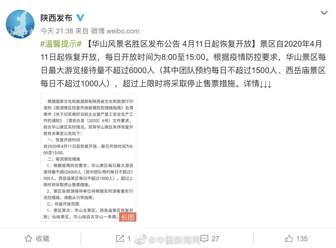 華山風(fēng)景名勝區(qū)4月9日發(fā)布公告,宣布華山風(fēng)景區(qū)4月11日起恢復(fù)開放。據(jù)@陜西發(fā)布 華山風(fēng)景名勝區(qū)發(fā)布公告稱,自2020年4月11日起恢復(fù)開放,每日開放時間為8:00至15:00。
