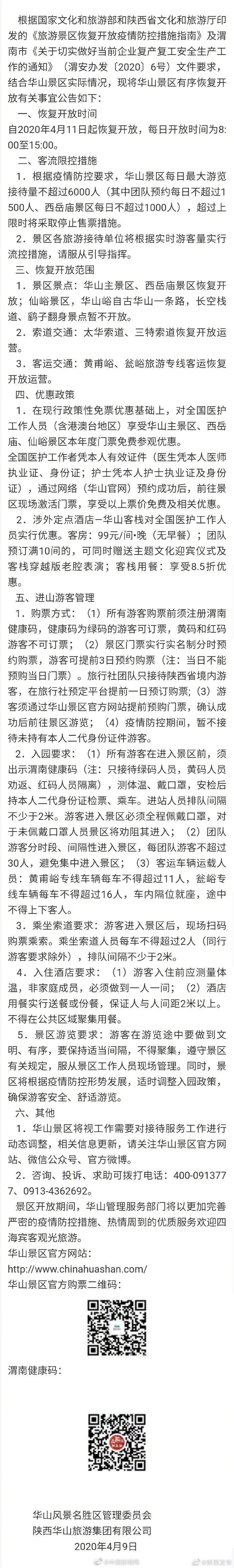 原標(biāo)題:華山風(fēng)景區(qū)11日起恢復(fù)開放 對醫(yī)護(hù)人員免門票