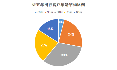 從年齡結(jié)構(gòu)來(lái)看,中青旅遨游網(wǎng)近五年訂單數(shù)據(jù)顯示,80和90后年輕家長(zhǎng)已成為出行主力軍,80后占比33%,90后占比24%;70后占比23%,60后占比16%。