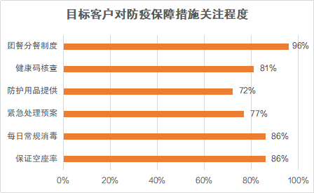 在旅游運(yùn)營(yíng)商選擇方面,區(qū)別于以往的“先看價(jià)格,再看服務(wù)”,客戶更關(guān)注“是否提供防疫保障,能否有效落實(shí)”。九成以上客戶表示,旅游過(guò)程中團(tuán)餐應(yīng)嚴(yán)格采用分餐制度,最大化保障用餐安全;八成以上客戶認(rèn)為,需要嚴(yán)控旅游大巴空座率、做好日常消毒工作。
