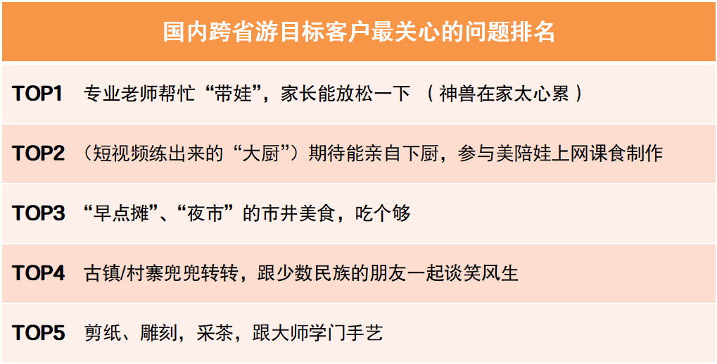 通過(guò)針對(duì)中青旅遨游網(wǎng)會(huì)員、中青旅聯(lián)盟成員單位的忠實(shí)客戶等群體的調(diào)研,以及近半年中青旅遨游網(wǎng)搜索、瀏覽的監(jiān)測(cè)數(shù)據(jù)進(jìn)行綜合分析。結(jié)果顯示,西南和西北是客戶喜好程度最高的兩大地域;云南、江蘇、新疆、三亞、陜西是客戶喜好程度最高的五大熱門目的地。客戶最關(guān)心的問題,帶娃、參與、美食、閑逛、學(xué)藝則位列前五名。