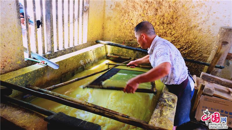 隆回縣灘頭鎮(zhèn)桃林村手工抄紙作坊,已經(jīng)成為一處著名的文旅項(xiàng)目景點(diǎn)。走進(jìn)陶林村,一棟棟青瓦石墻的新屋吸引了人們的目光。屋外山坡竹林茂密,山溪流水潺潺,屋內(nèi)手工抄紙制作的原料、工具布置的次序井然,手工抄紙的全套工藝流程在這幾棟屋中得以完整體現(xiàn)。手工抄紙技術(shù)歷史悠久,始于隋唐,至明朝時(shí)抄紙已經(jīng)非常盛行。上世紀(jì)八十年代鼎盛時(shí)還曾遠(yuǎn)銷東南亞和日本。非遺傳承人李志軍今年61歲,自稱“紙蟲”,帶領(lǐng)著全家人承襲著祖宗留下的獨(dú)特技藝。而支撐著李志軍的堅(jiān)守的,是隆回縣文旅部門的巨大付出和努力。2011年,他們支持李志軍建立了手工抄紙標(biāo)準(zhǔn)化作坊,2016年又對(duì)該作坊進(jìn)行擴(kuò)建,使之成為國家級(jí)非遺項(xiàng)目。灘頭手工抄紙作坊占地面積1714平方米,是灘頭手工抄紙有史以來最大的作坊,同時(shí)也是集生產(chǎn)、創(chuàng)新、傳承、展示、研學(xué)為一體的重要基地和文旅基地。