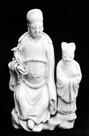 這件白瓷供養(yǎng)人像,為德化瓷人物像,釉面為純白色,色澤光潤明亮。整件雕塑由兩個(gè)人物構(gòu)成,一大一小,一主一副。主像高13.7厘米,身穿典型的明代服飾,人物端坐在山石上,衣著瀟灑,神態(tài)自然從容,盡顯雍容華貴,而手執(zhí)如意則似乎暗示著他內(nèi)心的向往和追求。整個(gè)構(gòu)圖自然放松,給人一種輕松的感覺。小人物則是長髯飄灑,笑容和藹可親,似乎帶著點(diǎn)職業(yè)習(xí)慣的微笑,雖然年紀(jì)比較大,但卻處于仆從的位置,手里還抱著一卷書。從一個(gè)側(cè)面烘托出了年輕主人的身份。