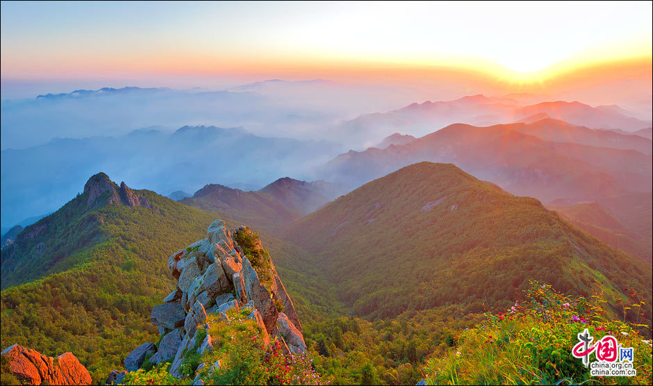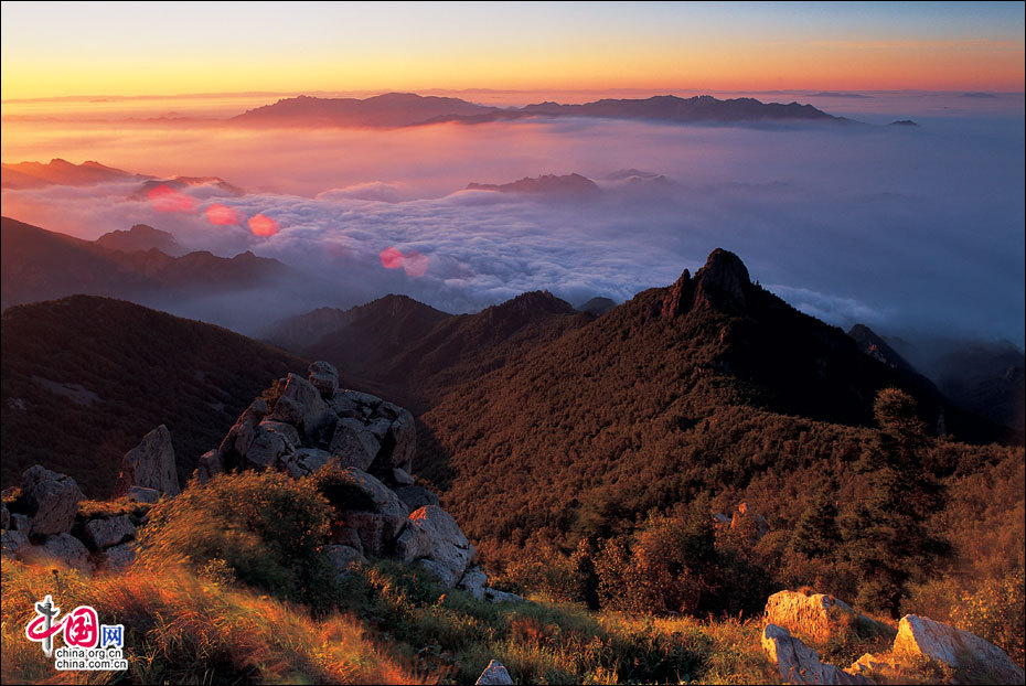 當(dāng)北京的第一縷陽(yáng)光從這里升起。站在海拔2118米的頂峰平臺(tái)上,遙望東方,天際中開(kāi)始露出幾抹灰色的浮云,隨后不斷地升騰、擴(kuò)大,繼而天邊漸紅,紅色越來(lái)越深,范圍越來(lái)越大,曙光漸露,丹霞輝映,把整個(gè)東方都變成濃濃的紅色。山峰在云霧中時(shí)隱時(shí)現(xiàn),彩云在天際間變幻,有時(shí)像奔馳的駿馬,有時(shí)像仙女飄逸,有時(shí)像玉樹瓊宮……千姿百態(tài),遐想無(wú)窮。猛然,比紅色的彩云更火紅、更光亮、更鮮艷的太陽(yáng)露出了一條邊弧,緩緩上升。四周的云霧似乎忍受不了她那光茫的照射而淡化、隱退,太陽(yáng)則很快掙脫了云霧與夜色的纏繞,迅速地上升,躍出天邊。霎時(shí),一輪紅日噴薄而出,金光四射,霞光瑞氣,照徹天宇,山巒、萬(wàn)樹沐浴著朝陽(yáng)的金輝,令人眼花繚亂。舉目四望,朝霞映照下的霧靈山,群峰起伏,云霧如海,波濤洶涌,九曲十八彎的旅游公路似戲水游龍,在峰巒間若隱若現(xiàn)。