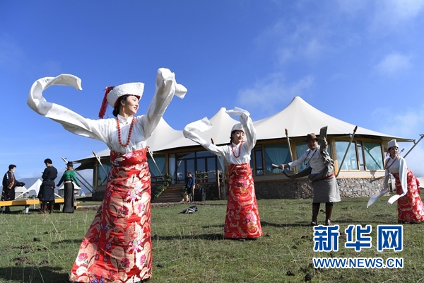 幾名藏族演員在甘南藏族自治州夏河縣阿木去乎鎮(zhèn)安果村阿米貢洪帳篷酒店的草原上表演舞蹈(5月25日攝)。新華社記者 陳斌 攝