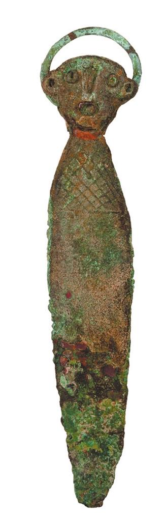 相比刀與叉,匕的出現(xiàn)要稍晚一些,甘肅省博物館收藏有人頭柄銅匕兩把,都是辛店文化(距今3400年—2800年)的產(chǎn)物,兩把人頭柄銅匕都采集于甘肅省廣河縣。一把人頭柄銅匕造型比較拙樸,匕身平直呈長(zhǎng)舌狀,末端為圓弧形并微上翹。柄首為人頭形,高鼻,圓眼,厚唇微張,半環(huán)形雙耳,一耳殘缺。另一把人首柄銅匕同前一把人頭柄銅匕造型相似,但做工卻要精美許多,這把銅匕柄首也是人頭形,高鼻,圓眼,圓口,雙耳為半環(huán)形,頸部涂紅色,身體為方格網(wǎng)紋。這把人頭柄的人面雙目圓睜,嘴微張,一副機(jī)靈驚詫的表情,比前一把人頭柄銅匕人面憨直質(zhì)樸的面目更有意趣。這是兩把還沒(méi)成為武器的銅匕,但它已經(jīng)有了勺子的雛形。