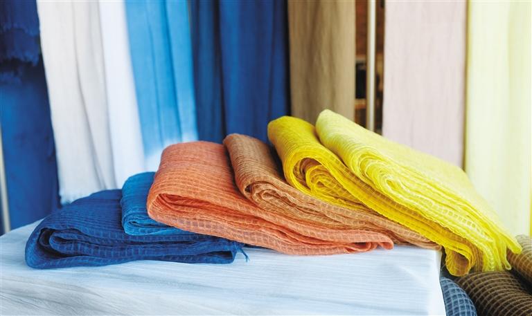 采用棉、毛、絲、麻幾種天然纖維,運(yùn)用中藥材古法染色技藝制成。使用紅花染、黃檗染、藍(lán)靛染等染制出的成品絲巾色澤亮麗,質(zhì)感舒適,天然無(wú)污染。