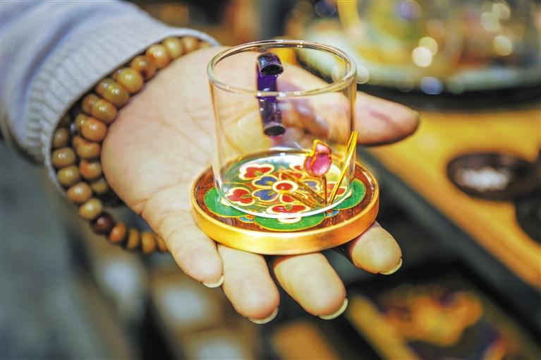 在李海明琺瑯?biāo)囆g(shù)館,記者看到工藝師們正在專注地進(jìn)行藝術(shù)創(chuàng)作。在展示架上,飛天琺瑯釉擺件、戲曲人物擺件、琺瑯墨匙、琺瑯茶墊等小文創(chuàng)作品令人目不暇接,就連手機(jī)殼、小鏡子這些小物件也因與琺瑯的融合變得新穎而獨(dú)特。