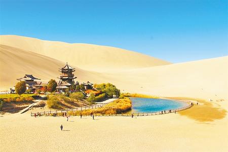 鳴沙山月牙泉是敦煌諸多自然景觀中的佼佼者,古往今來以“沙漠奇觀”著稱于世,被譽(yù)為“塞外風(fēng)光之一絕”。月牙泉、莫高窟九層樓和莫高窟藝術(shù)景觀融為一體,是敦煌城南一脈相連的“三大奇跡”,成為中國乃至世界人民向往的旅游勝地。