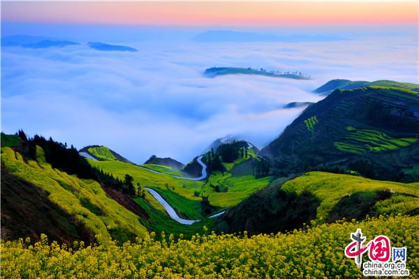 云南省羅平縣無處不風(fēng)景。春季的馬街,桃花、梨花、李花、山茶花、油菜花、杜鵑花、馬纓花把一座座山峰映襯得如詩如畫。佇立牛頭山俯視云層,漫無邊際的白云在山麓翻滾、碰撞、擁擠,雖沒有海的蔚藍與呼嘯之態(tài),卻有海的浩瀚與壯闊。站在山巔呼吸沁人心脾的清新空氣,聽山風(fēng)掠過林梢的聲音,云霧升騰時如夢如幻,仿佛有仙人騰云駕霧下凡而來。