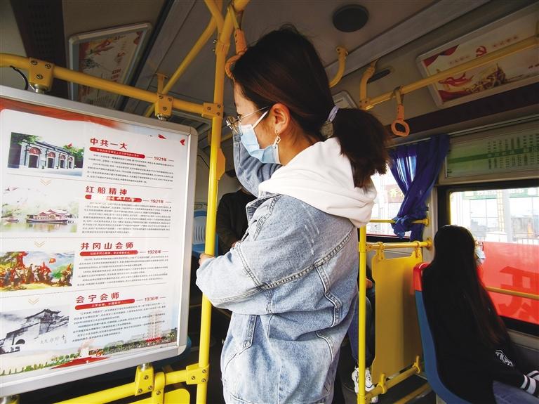黨史學(xué)習(xí)教育主題車廂的車體外部掛有醒目的黨史宣傳標(biāo)語,走進車廂,風(fēng)道展板上以黨史故事的形式,圖文并茂、生動形象地展示著紅船精神、井岡山精神、長征精神、遵義會議精神、延安精神、西柏坡精神、抗美援朝精神、戰(zhàn)疫精神等內(nèi)容。車廂內(nèi)的座椅靠背、宣傳欄等處也印有不同的黨史宣傳知識,公交車廂成了黨史學(xué)習(xí)教育的流動“微課堂”。乘坐在黨史學(xué)習(xí)教育主題公交車上,乘客便可重溫中國共產(chǎn)黨波瀾壯闊的輝煌歷程,汲取民族復(fù)興的精神力量。