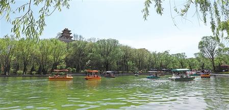 5月1日,游客在平?jīng)鍪辛珗@泛舟,享受假日美好時(shí)光。新甘肅·甘肅日報(bào)通訊員 吳希會(huì)