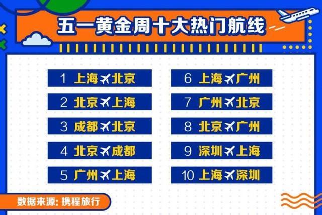 《報告》稱,今年五一期間,消費(fèi)者跨省出游意愿強(qiáng)烈,攜程機(jī)票單日訂單量對比2019年同期最高增幅約28%。上海-北京、北京-上海、成都-北京、北京-成都、廣州-上海、上海-廣州、廣州-北京、北京-廣州、深圳-上海、上海-深圳為“五一”黃金周十大熱門航線。