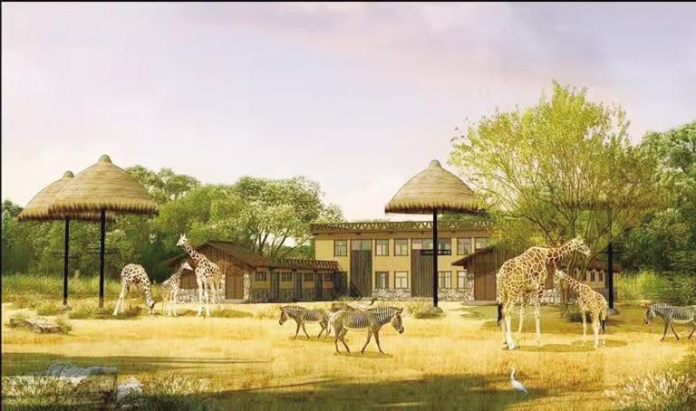 非洲草原區(qū)籠舍和展館主要位于中心位置,建筑風格以非洲部落建筑形式為主,體現(xiàn)非洲原始部落生活風貌。這里有狒狒館、鬣狗館、非洲草原混養(yǎng)區(qū)(長頸鹿和斑馬籠舍、羚羊館)河馬館和黑猩猩館。