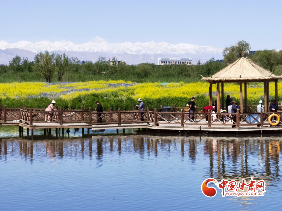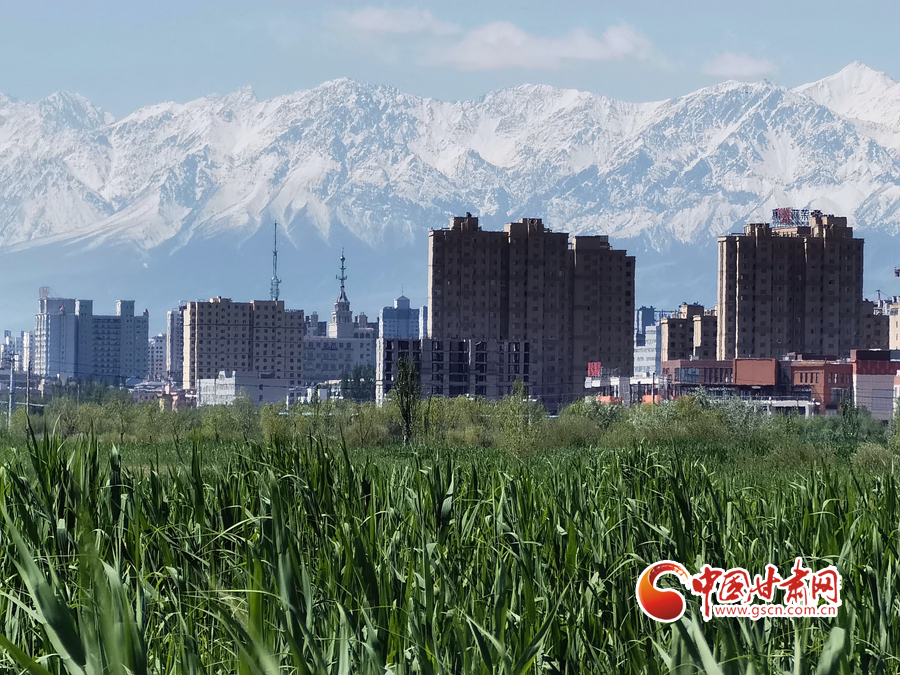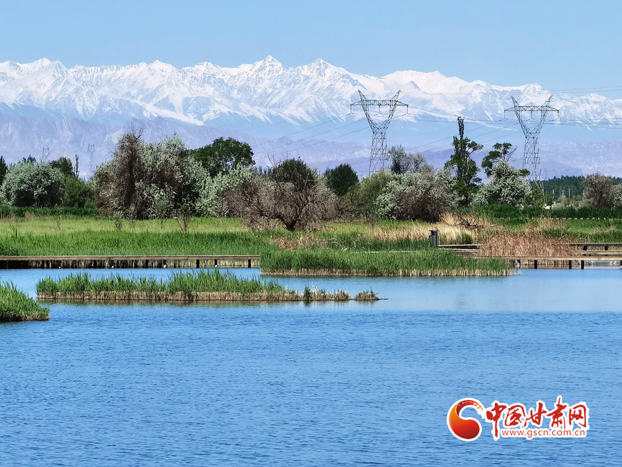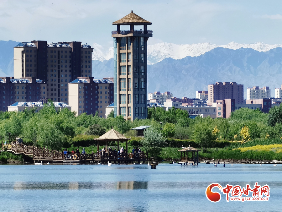 初夏時節(jié),祁連山下的甘肅省張掖市草木翠綠,湖水蕩漾,在皚皚白雪的映襯下別有一番景色。