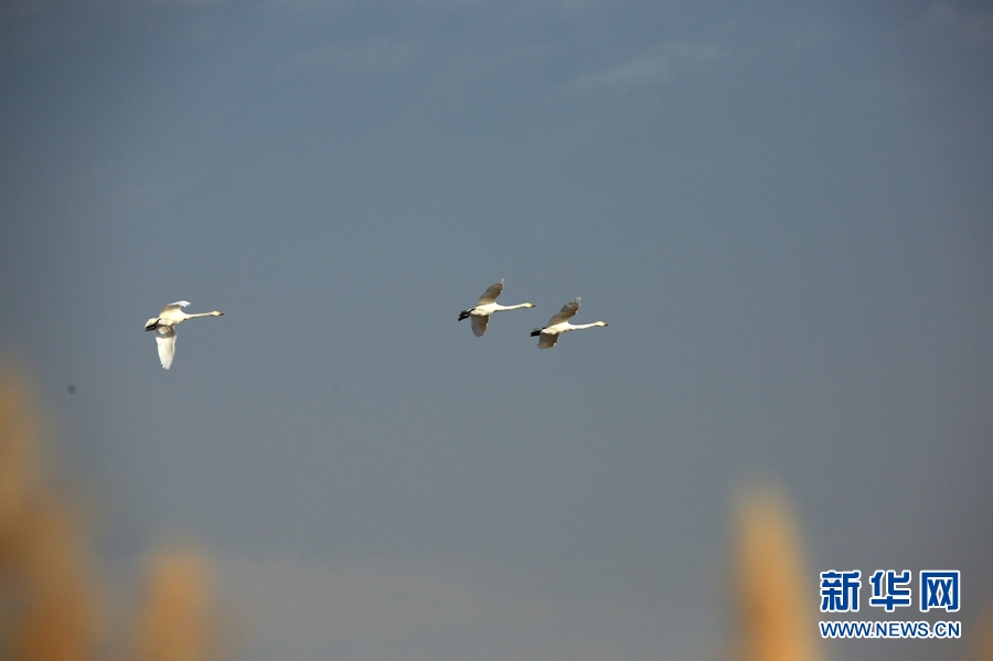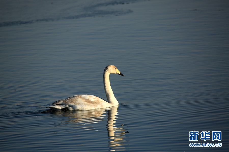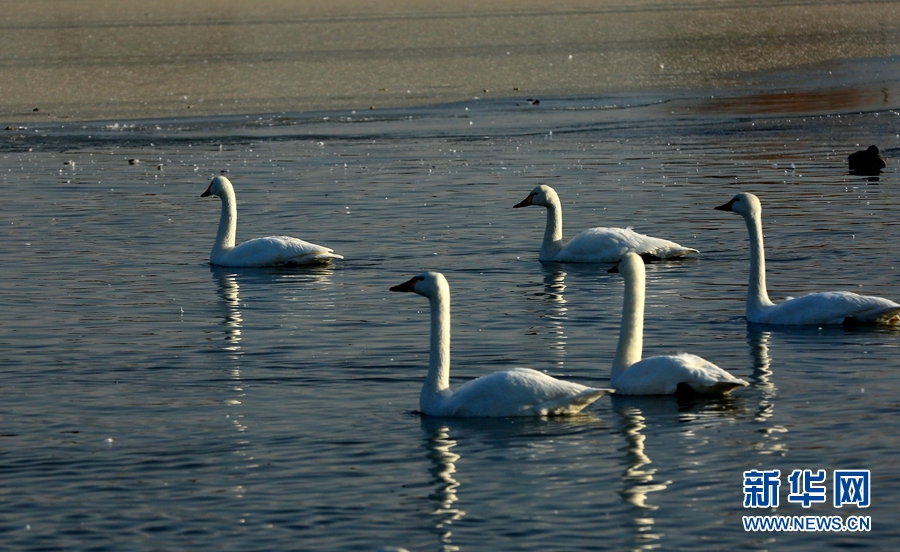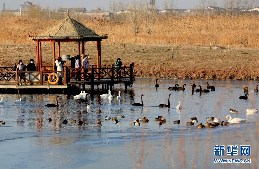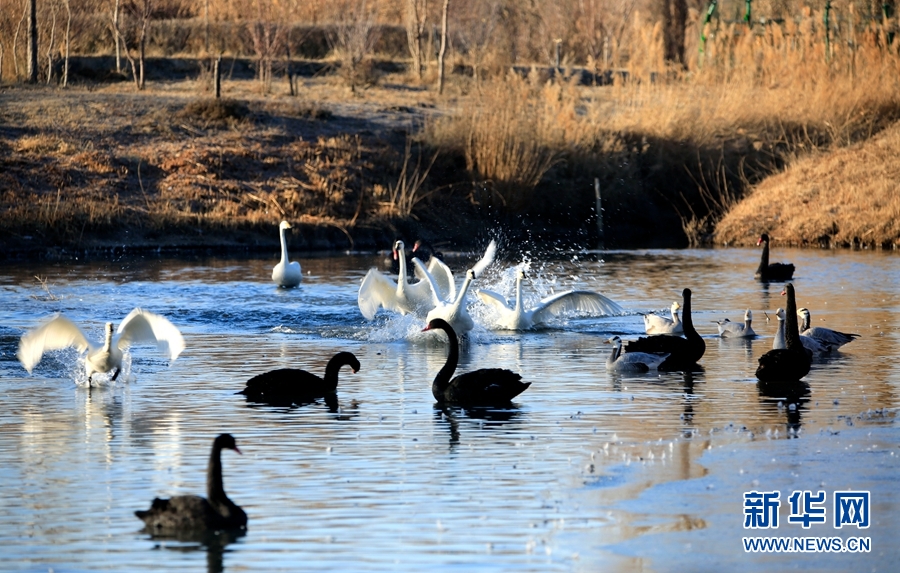 冬日清晨的甘肅省張掖國家濕地公園里碧波蕩漾,成群的白天鵝、黑天鵝等鳥類聚在一起游弋嬉戲,歡騰跳躍,成為一道亮麗的風景線,吸引眾多游客觀賞拍照。新華網發(fā)(陳禮 攝)