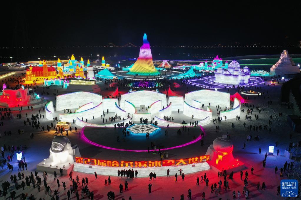 2021年12月25日,游客在哈爾濱冰雪大世界園區(qū)游玩(無(wú)人機(jī)照片)。