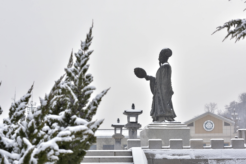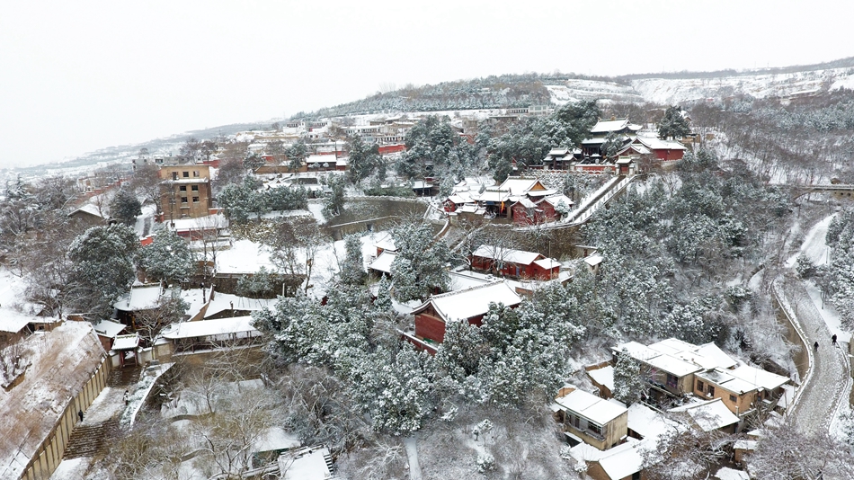 群峰環(huán)列,渭水在南北兩山間由西向東流過(guò),形成一幅天然的太極圖。雪中透出大地色的樸拙,給予山川大地最初的模樣,層層繞繞的山路,修葺出渾然天成的萬(wàn)物法則,也訴說(shuō)著亙古不變的始祖智慧之起源。