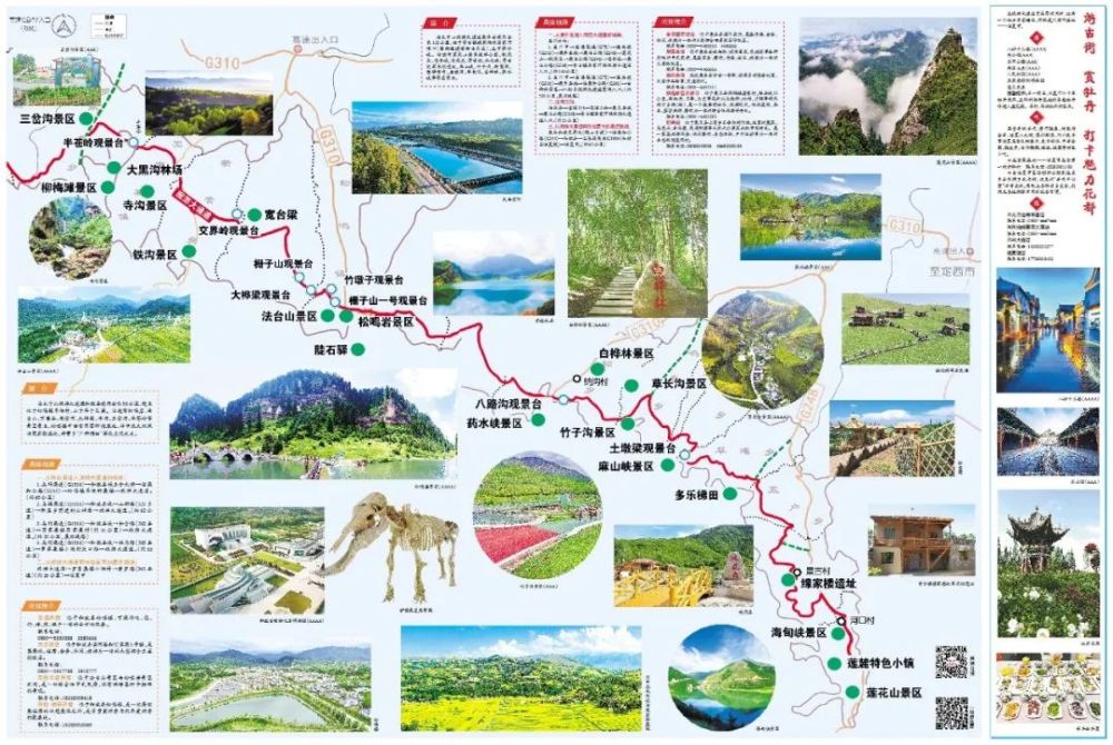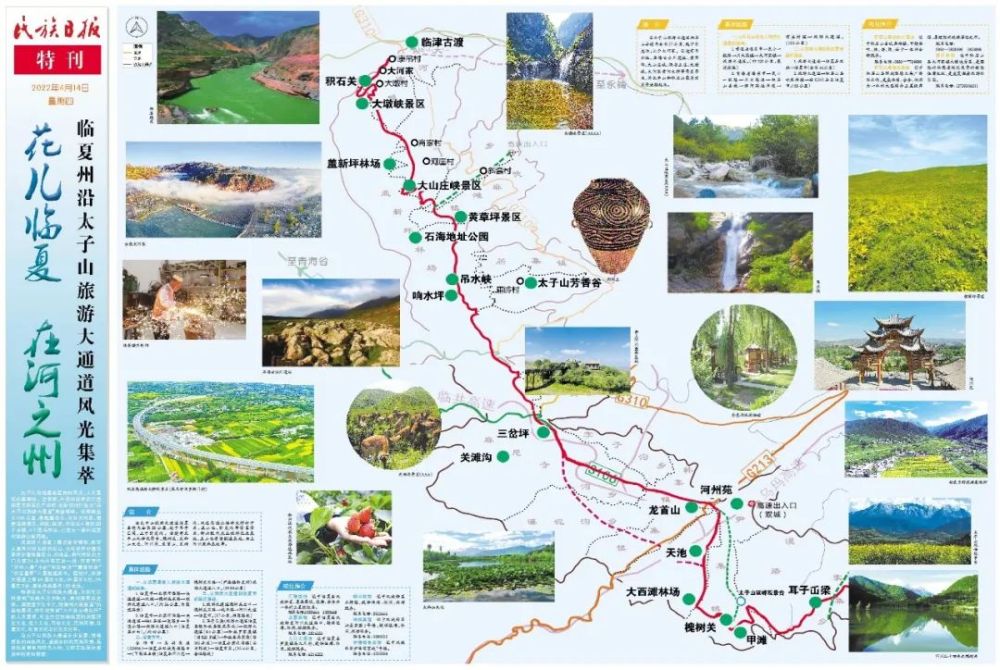 暢游沿太子山旅游大通道,不僅可以欣賞到“雙峽中分天際開,黃河擁雪排空來。奔流直下五千丈,怒濤終古轟春雷”的自然景觀,亦可欣賞到“八千游女唱牡丹”的人文景觀,可全方位領略臨夏的關隘歷史文化、花兒文化、民俗文化、民族風情、非遺文化、飲食文化及紅色文化等。