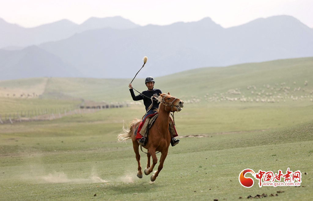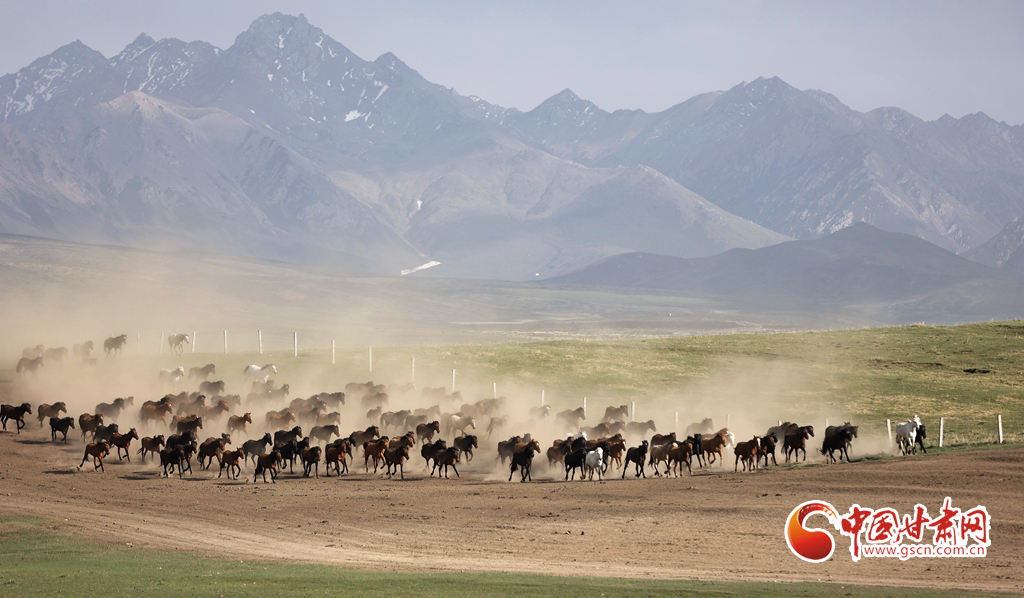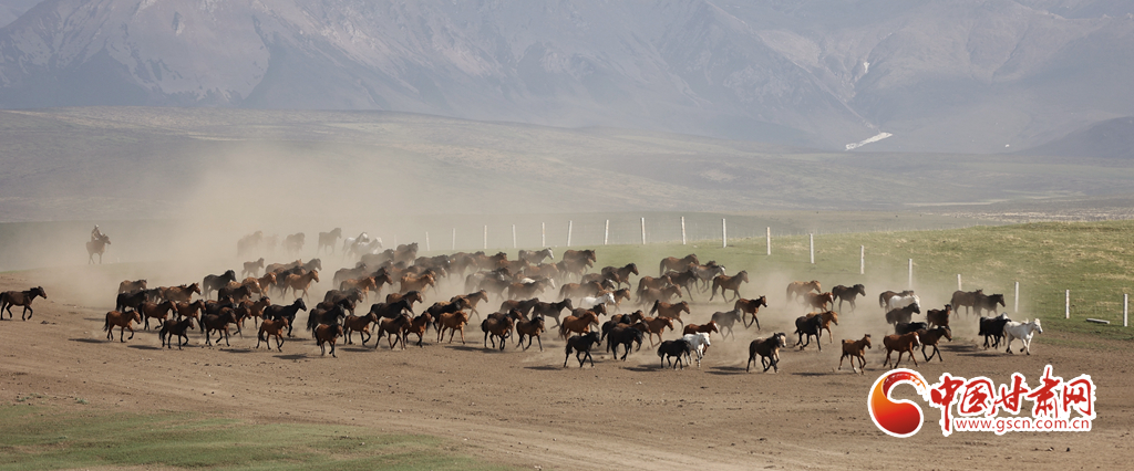 夏日,位于祁連山北麓的甘肅張掖山丹馬場(chǎng)綠草如茵,牧馬人揚(yáng)鞭催馬,山丹馬場(chǎng)再現(xiàn)萬(wàn)馬奔騰景象。