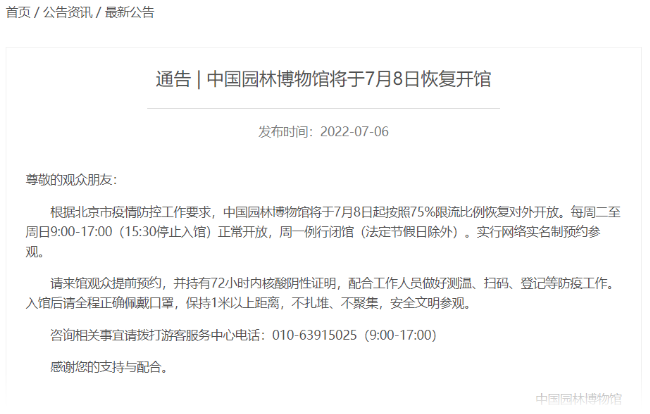 中國園林博物館發(fā)布最新消息,根據(jù)北京市疫情防控工作要求,中國園林博物館7月8日起按照75%限流比例恢復(fù)對(duì)外開放。