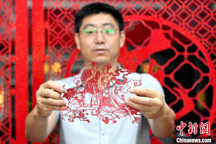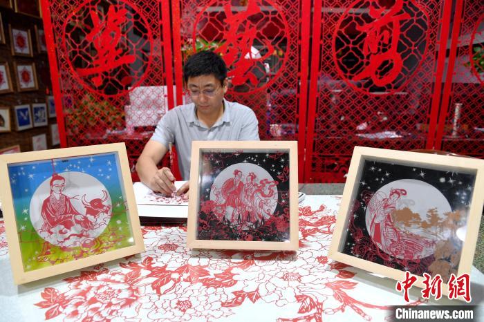 8月4日,是中國(guó)傳統(tǒng)節(jié)日七夕節(jié)。河北省衡水市阜城縣剪紙藝人尤金水創(chuàng)作了《牛郎》《織女》《鵲橋相會(huì)》三幅“七夕”剪紙作品,傳遞千年浪漫情。據(jù)介紹,作品采用阜城剪紙陽刻的手法,裝裱后利用立體投影的方式,可以把畫面投影到“月亮”上,既浪漫又神奇。