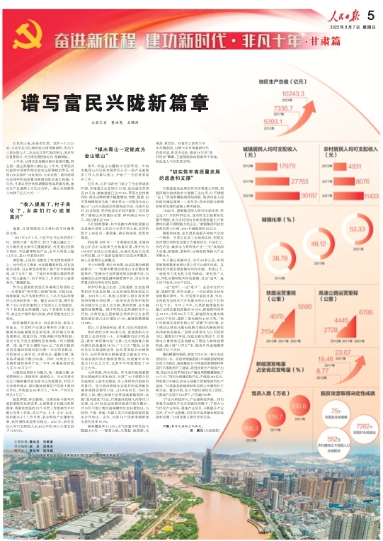 8月7日,人民日?qǐng)?bào)刊發(fā)“奮進(jìn)新征程 建功新時(shí)代·非凡十年”甘肅篇,重磅推出兩塊整版,聚焦黨的十八大以來(lái),隴原兒女牢記習(xí)近平總書(shū)記的殷切囑托,踔厲奮發(fā)、銳意進(jìn)取,埋頭苦干、勇毅前行,加快建設(shè)幸福美好新甘肅,不斷開(kāi)創(chuàng)富民興隴新局面。