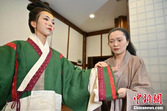 蔣雨林介紹其手工復(fù)原制作的漢服飾。