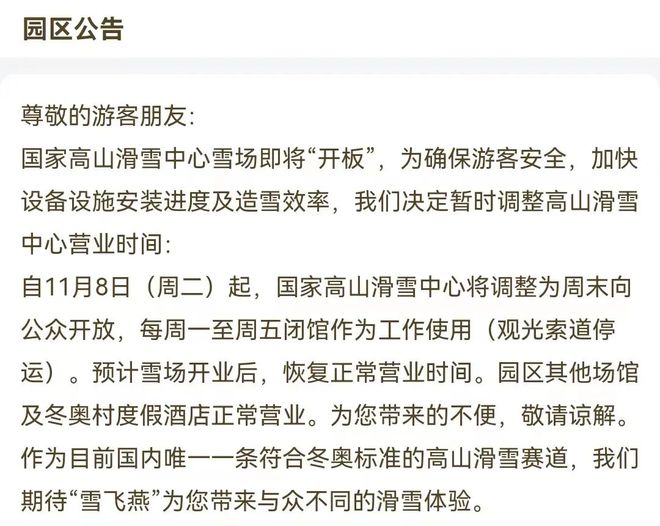 根據(jù)公告,自11月8日(周二)起,國家高山滑雪中心將調(diào)整為周末向公眾開放,每周一至周五閉館作為工作使用(觀光索道停運(yùn))。預(yù)計(jì)雪場開業(yè)后,恢復(fù)正常營業(yè)時(shí)間。目前,“雪飛燕”已對外開放,如果纜車開放,便可以乘坐纜車上到山頂。