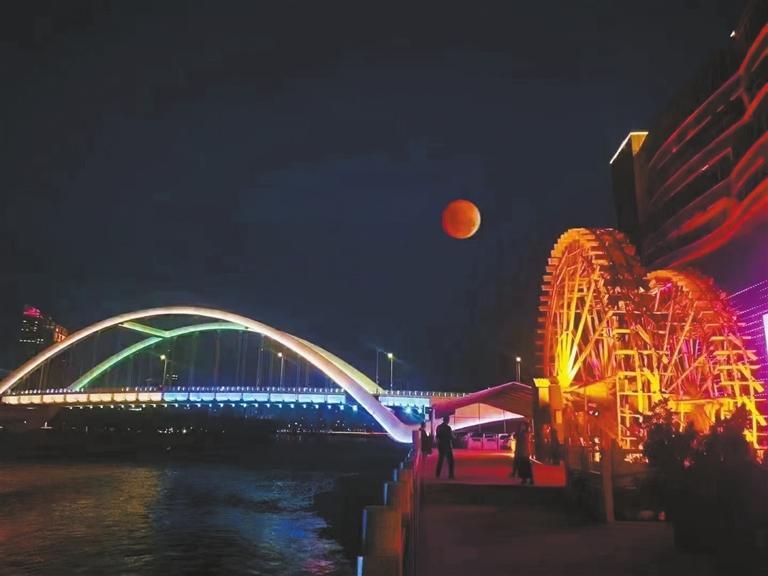 這是11月8日晚網(wǎng)友在蘭州黃河風(fēng)情線(xiàn)拍攝的月食。