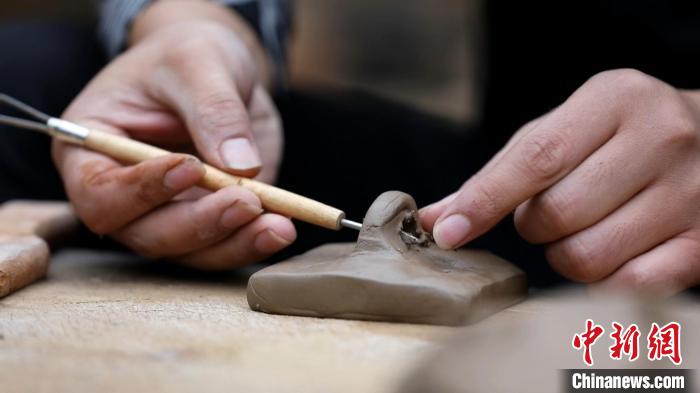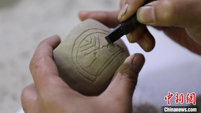 蔣繼濤說,柴燒陶印的制作過程,結(jié)合了書法繪畫、手工雕塑等技藝。“陶印的制作流程主要包括選土、配土、過濾、沉淀、制紐、晾曬、打磨、篆刻、入窯、燒制等程序,不僅要精通書法篆刻,還要熟悉雕法、燒窯等。”蔣繼濤一邊介紹,一邊手持刻刀。鋒利的刀尖在陶印上不斷游走,吹去浮塵,一枚古樸的柴燒陶印制作完成。
