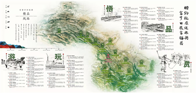 據(jù)介紹,手繪圖以“相約隴原促振興·富了口袋富腦袋”為主題,突出“圖文并茂、服務(wù)游客、便于攜帶、適于珍藏”等特點(diǎn),對2022年創(chuàng)建的6個(gè)鄉(xiāng)村旅游示范縣,60個(gè)文旅振興鄉(xiāng)村樣板村全部開發(fā)設(shè)計(jì)了電子“二維碼”,設(shè)置了甘肅省鄉(xiāng)村旅游60條四季精品線路,生動(dòng)形象地展現(xiàn)了甘肅鄉(xiāng)村旅游特色元素和資源產(chǎn)品信息,對幫助游客暢游甘肅鄉(xiāng)村、感知隴原文化、體驗(yàn)鄉(xiāng)村魅力具有重要意義。