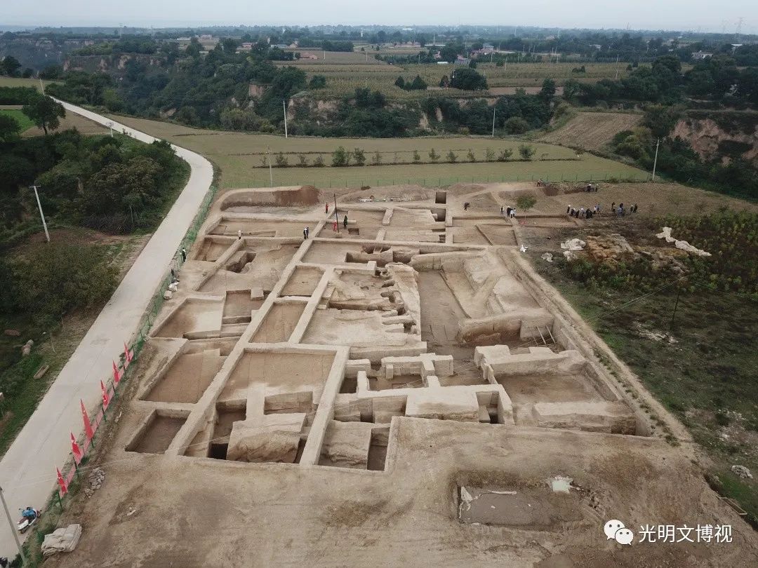 甘肅慶陽(yáng)西峰西郊的南佐遺址,坐落在黃土高原第一大塬——董志塬上,傳說(shuō)中這里是黃帝部族的重要活動(dòng)地域,也是以農(nóng)業(yè)著稱的周人祖先不窋?shù)睦霞摇D献暨z址發(fā)現(xiàn)于1958年,1984—1986年和1994—1996年有過(guò)兩個(gè)階段的發(fā)掘,從2021年開(kāi)始第三階段的發(fā)掘和調(diào)查、勘探工作,基本確認(rèn)這是一處以仰韶文化晚期大型聚落為主體的遺址,遺址面積在600萬(wàn)平方米以上,可能有外環(huán)壕。聚落中部是由9座方形夯土臺(tái)及其環(huán)壕圍成的面積約30萬(wàn)平方米的核心區(qū),核心區(qū)中部偏北是數(shù)千平方米的由“護(hù)城河”和夯土宮墻圍成的“宮城”。“宮城”中心為主殿,“九臺(tái)”之外還有多處居住區(qū)、夯土臺(tái)、溝渠水利設(shè)施等遺存,出土了大量白陶、黑陶等珍貴遺物和大量水稻,從多個(gè)方面顯現(xiàn)出早期國(guó)家和文明社會(huì)的氣象。