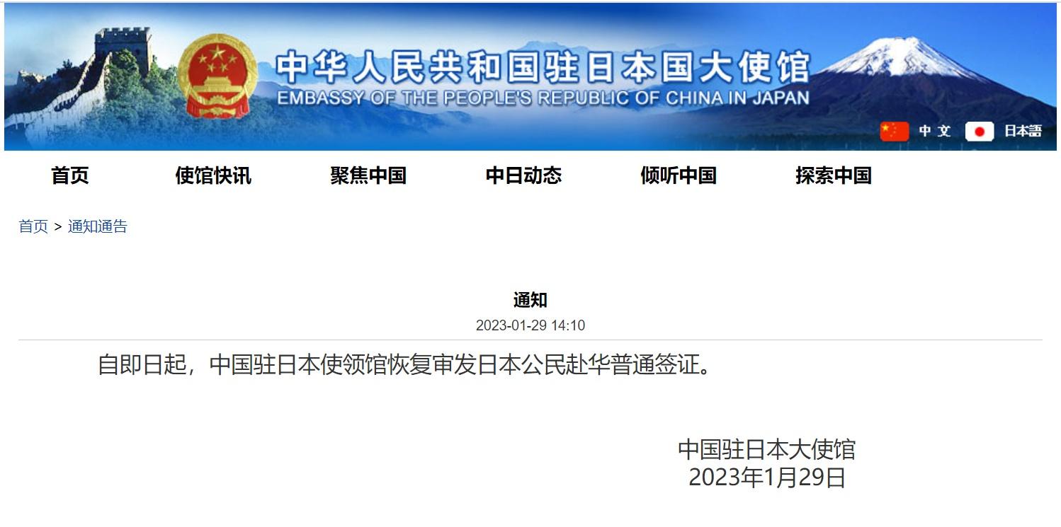 中國駐日本使領館1月29日宣布:自即日起,中國駐日本使領館恢復審發(fā)日本公民赴華普通簽證。