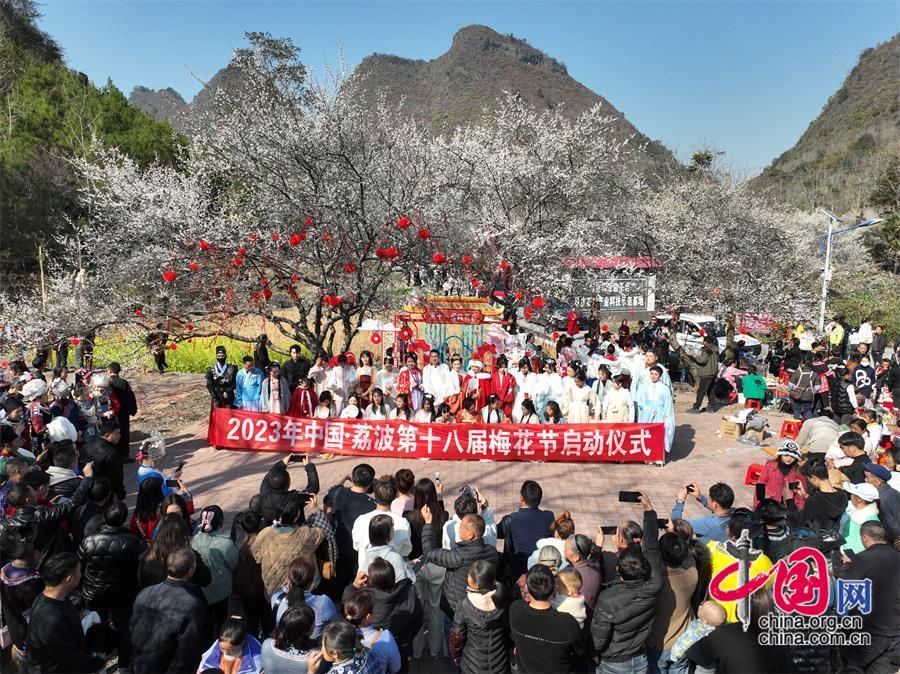 眼下,荔波縣萬(wàn)畝梅原景區(qū)已經(jīng)進(jìn)入最佳觀賞期。1月30日,2023年中國(guó)·荔波第十八屆梅花節(jié)開幕,八方游客齊聚荔波縣黎明關(guān)水族鄉(xiāng)萬(wàn)畝梅原景區(qū),聽曲、賞梅、品茗、觀演出,共賞梅原盛景。