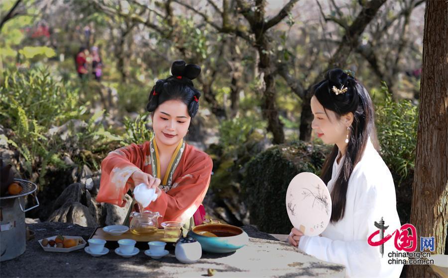 一朵梅花寓五福,一山梅花賀新春。梅原里,游客們或賞花祈福、或獨(dú)自品溫,或拍照打卡,盡情享受賞梅樂趣。還有不少游客,為了應(yīng)景,更是穿著古風(fēng)漢服或少數(shù)民族服飾,沉浸式打卡梅花節(jié),游客林女士說:“古裝配梅花,清麗脫俗,既感受到傳統(tǒng)文化之美,也為賞梅之旅增添了色彩。”