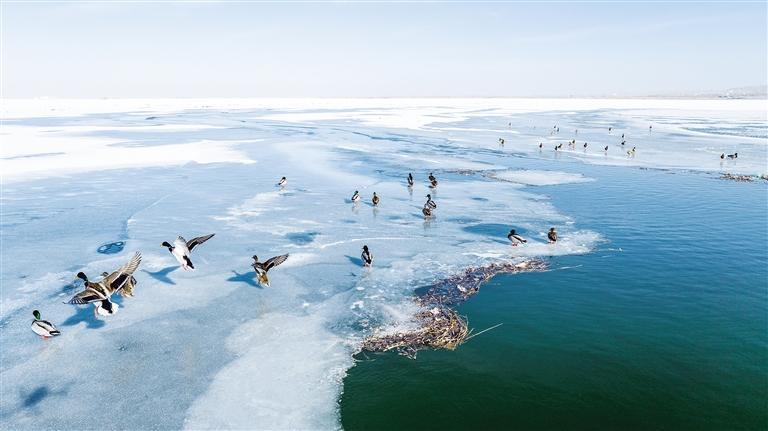 中國甘肅網(wǎng)2月3日訊 據(jù)蘭州晚報報道(通訊員 李永華 魏生明 記者 高慧霞 攝)2月2日,位于金塔縣的解放村水庫,越冬候鳥綠頭鴨、赤麻鴨成群結(jié)隊。隨著金塔縣生態(tài)環(huán)境的持續(xù)改善和好轉(zhuǎn),近幾年過境候鳥數(shù)量持續(xù)升高,每年冬天都有綠頭鴨、赤麻鴨等鳥類遷徙到解放村水庫等濕地越冬。