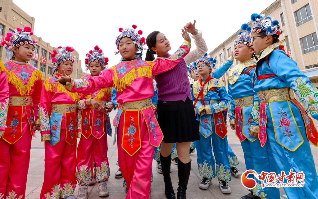 3月22日,在甘肅省張掖市民樂縣洪水小學,戲曲演員正在給同學們指導戲曲動作、傳授唱腔。