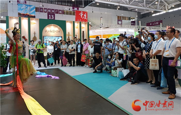 《絲路花雨》第二十一代英娘扮演者、青年舞蹈家康琦是深圳文博會甘肅文化形象大使,她也帶著《絲路花雨》精彩片段走進如意甘肅館,用敦煌舞姿為甘肅代言。