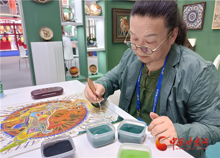 深圳文博會首日,李海明選擇現(xiàn)場制作九色鹿掐絲琺瑯畫。