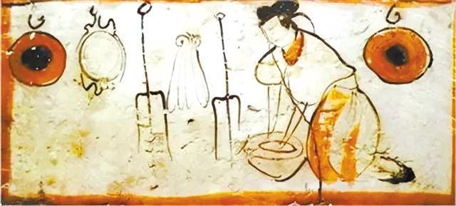 嘉峪關新城三號墓曾出土一塊畫像磚,圖為女子在盆中揉面,后面的墻上掛著鐺、箕等廚具。