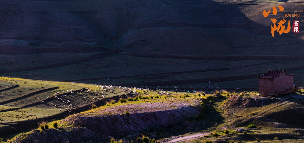 夕陽西下,草原,房屋,羊群,山脈……融為一體,猶如一幅淡墨山水畫躍然紙上,熠熠生輝。