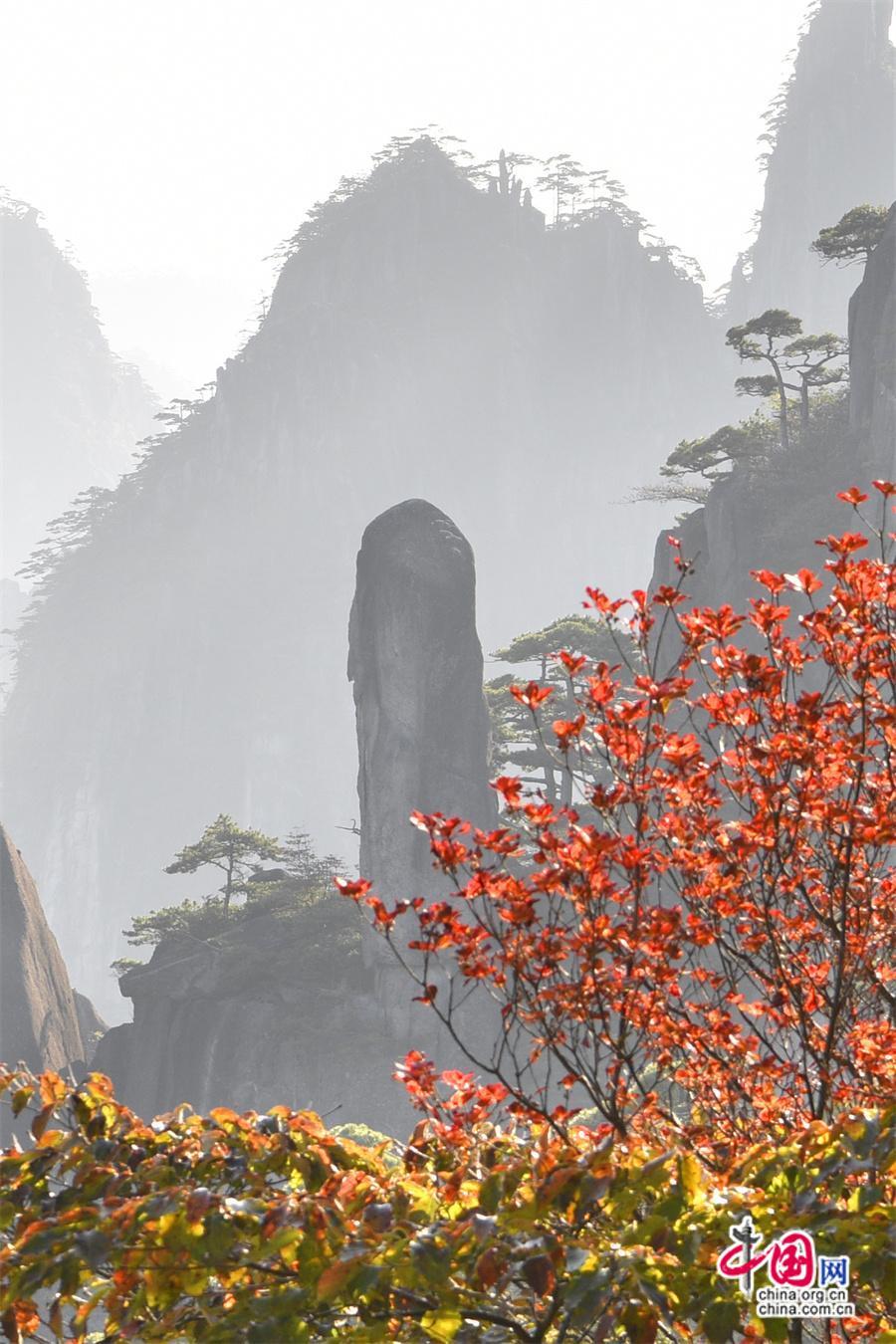 秋日黃山,雨后放晴最為嫵媚。蔚藍(lán)色的天空一塵不染,山間綿連不斷的云海,時而像海浪在空中翻滾,擁擠著、碰撞著,時而像一匹白紗綢緞,環(huán)繞在山巔上、飄散在松林間,只見黃山的紅葉點點散落,紅綠相間,與峻峭山峰、藍(lán)天云海、奇松怪石,精致婉約地繪成一幅幅五顏六色的山林畫卷,正是登游好時節(jié)。(姚育青)