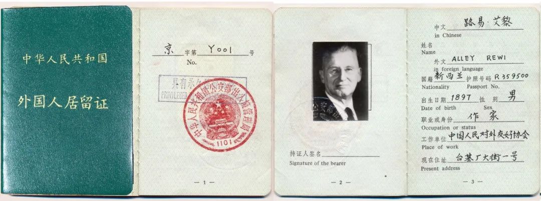路易·艾黎的外國(guó)人居留證
